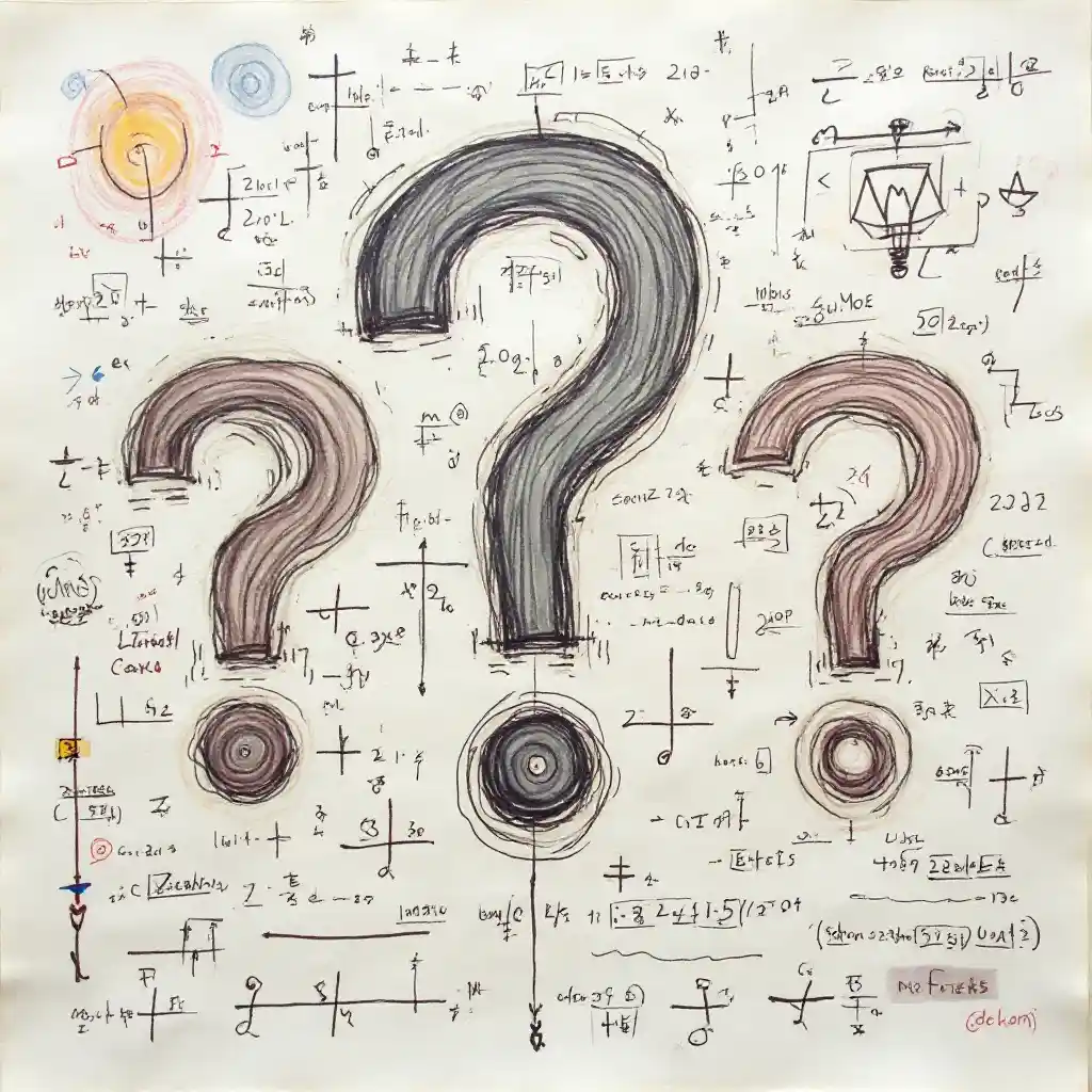 лист бумаги, полный написанных надписей, математических формул и геометрических форм, с тремя огромными вопросами в центре