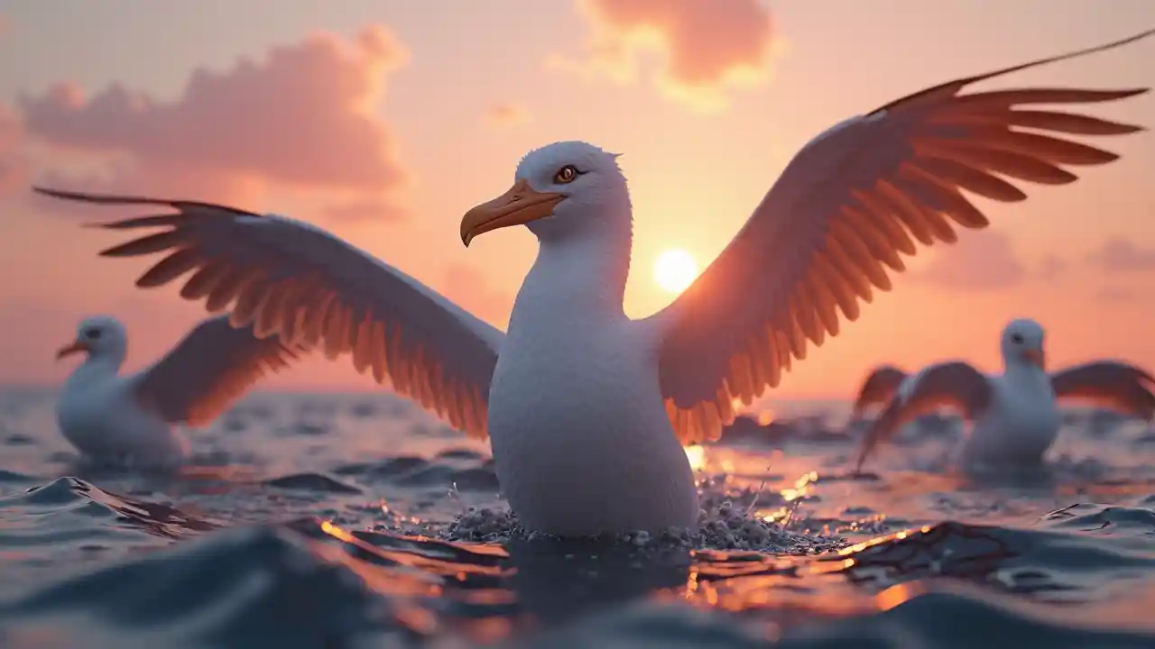 Метаверс, UX, футуристический, красивый альбатрос, красивые глаза, открытые крылья, портрет, красивые цвета, реалистичные и гипердетальные, сделанные в кино 4d, магический реализм, красивый заход солнца, южный океан, масштаб