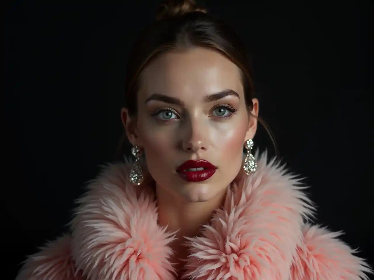 Минималистский портрет красивой женщины с красными губами и холодными большими глазами, носящей серьги, светло-розовое меховое пальто в стиле высокой моды, изолированное на темном фоне, кинематографическое освещение, ультрареалистичный, сделанный в стиле Hasselblad X2D + Pishington E Skinner + Peter Coulson, минимализм --ar 5164