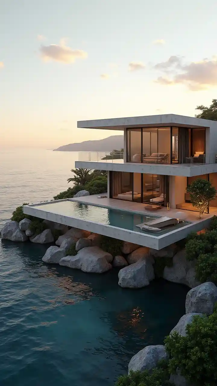 Потрясающая гиперреалистическая фотография из современного дома 21-го века, с гладкими бетонными краями и расширенными стеклянными стенами, отражающими окружающую красоту. Резиденция грациозно расположена у тихого, огромного моря, отражая суть золотого часа, когда теплое солнечное излучение блестит. Сцена акцентирована на пышной зеленом, окружающем здание, и стильный бассейн с бесконечным пространством, который, кажется, идет в ногу с океаном, улучшая роскошную атмосферу этого архитектурного чуда.