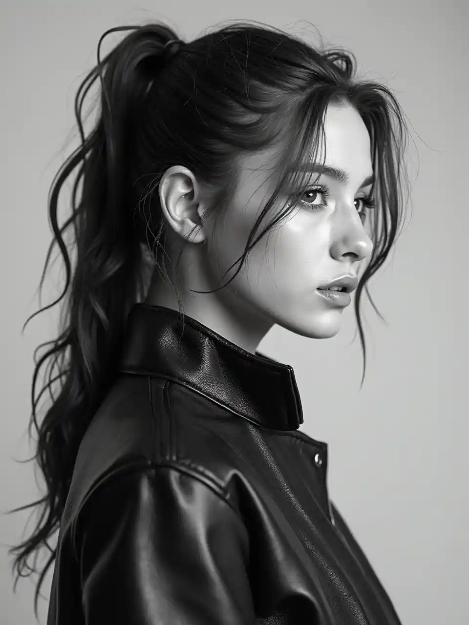 Высокодеталированный черно-белый портрет молодой женщины с острым челюстью и с выраженными чертами. Ее длинные, слегка распущенные волосы привязаны к спине впустую, с свободными нитями, обрамляющими ее лицо. Она носит кожаное куртку с высоким воротником, излучая хладнокровное, уверенное в себе отношение. Фон минимальный и нейтральный, подчеркивая гиперреалистичное качество изображения. Студийное освещение, монохромный стиль, элегантная и современная композиция.