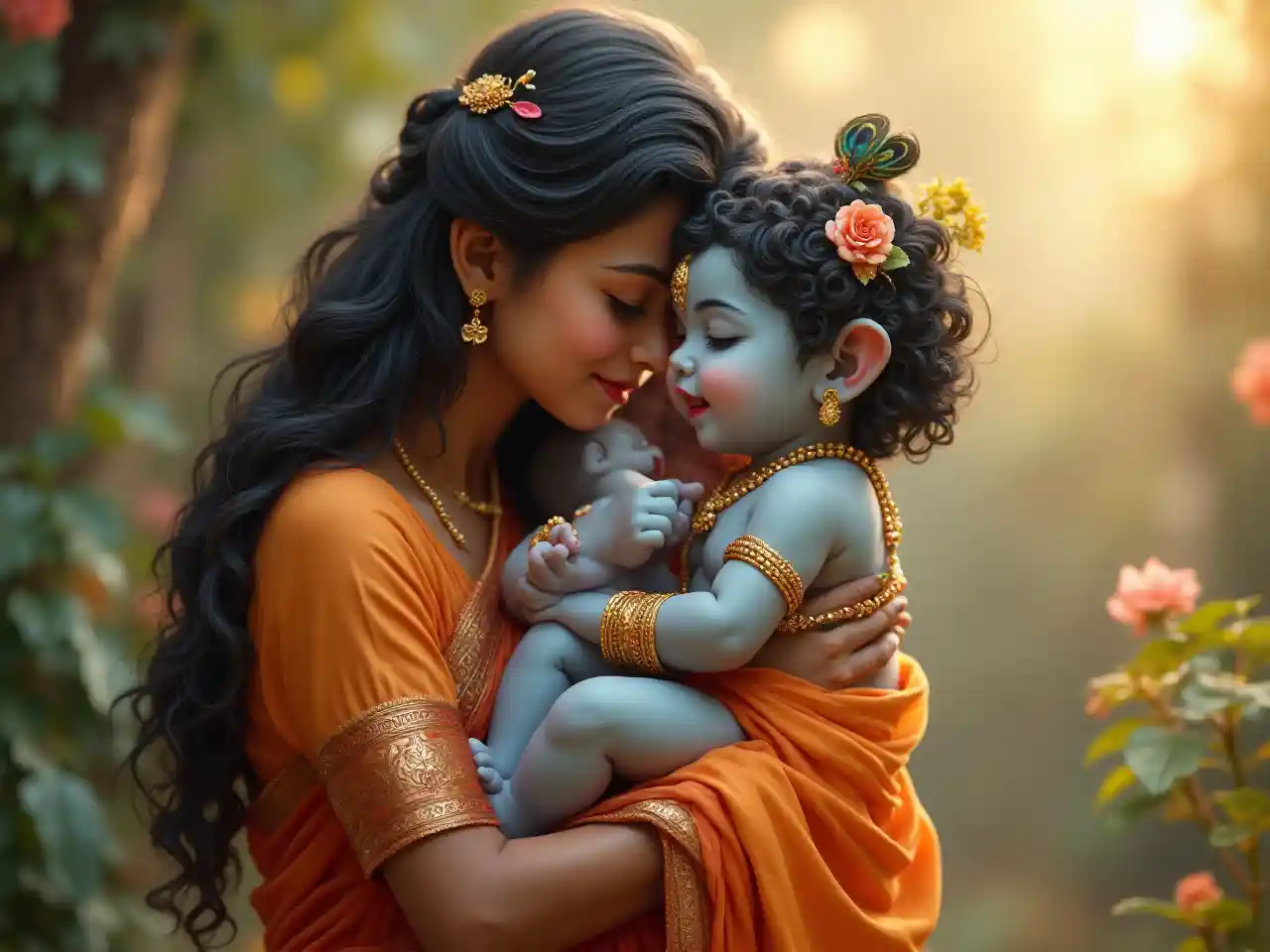 Очаровательное и спокойное изображение матери, держащей своего божественного ребенка с голубой кожей, лорда Ганеша, в любящем объятии. Ребёнок с черными волосами, украшенными павиным перцем, носит тонкие золотые украшения, в том числе браслеты и. Мать одета в ярко-оранжевое сари с сложными узорами, ее длинные черные волосы украшены цветами и украшены украшениями. На фоне мягкая, размытая природа с намеками листьев и теплого солнечного света, создавая эфирную и мирную атмосферу. В общем, образ исполнен нежности, любви и божественности".