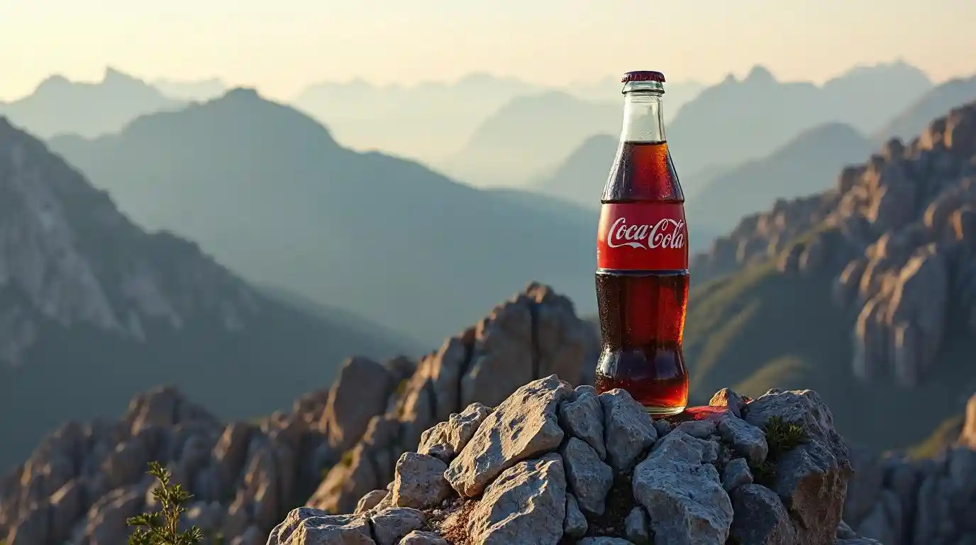 Потрясающая картина бутылки Кока-Колы, расположенной на вершине величественной горы, окруженной панорамным видом на скалы. Иконичная красная надпись бутылки выходит на естественные, грубые тона горы. Мягкий, золотой солнечный свет освещает сцену, бросая длинные тени и добавляя тепло, подчеркивая величие этой уникальной обстановки.