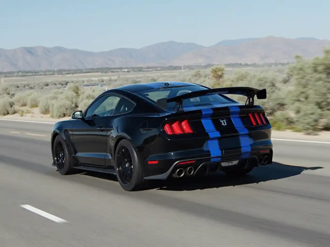 EvelynЧерный Форд Мустанг ГТ с синими полосами, едущий по дороге.
