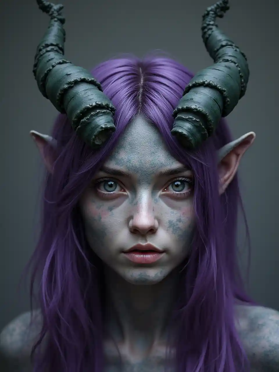 Фиолетовые волосы с дымящейся серой кожей и темно-зелеными рогами на голове