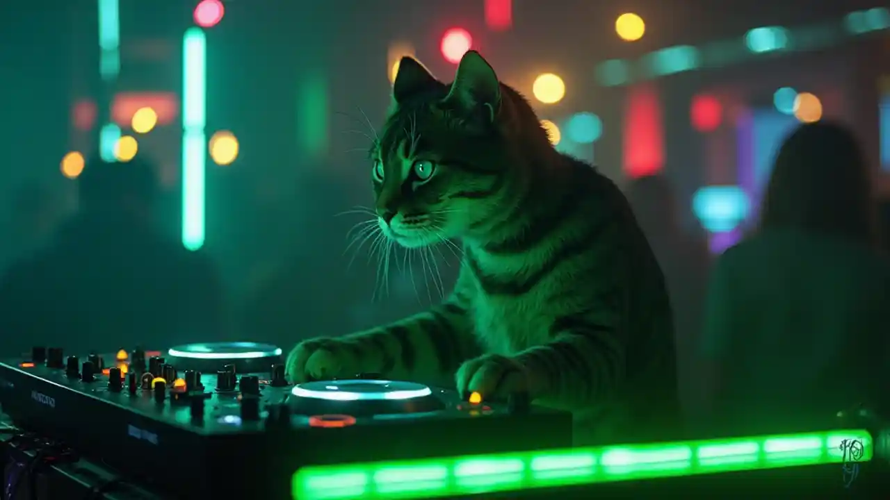 stxphКот диджей в ярком клубе с неоновыми зелеными огнями