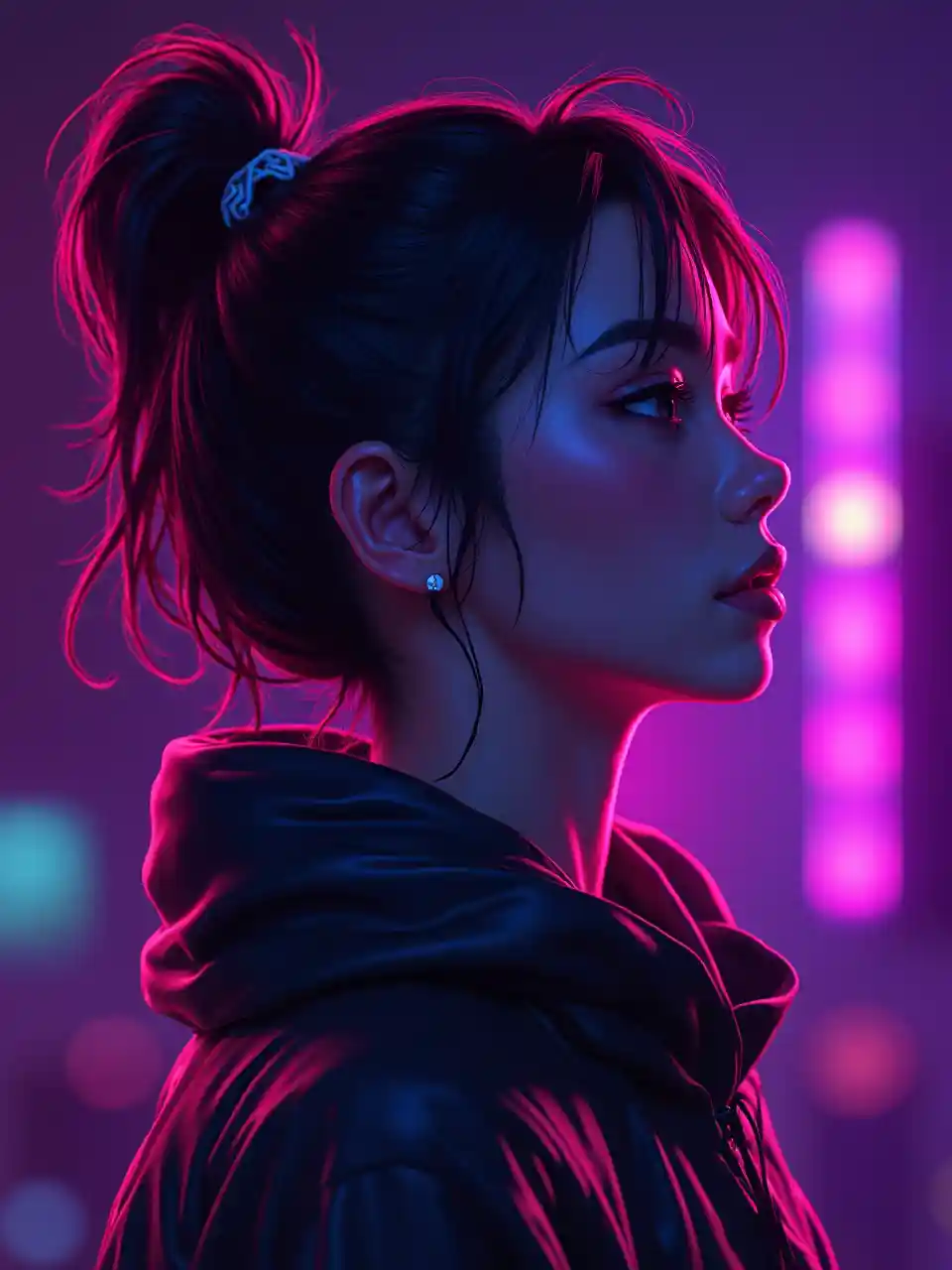 Девушка из неонов, черно-фиолетовый фон