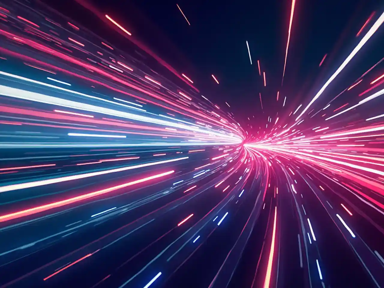 Абстрактная иллюстрация с яркими неоновыми линиями, излучающимися наружу, создавая ощущение скорости.