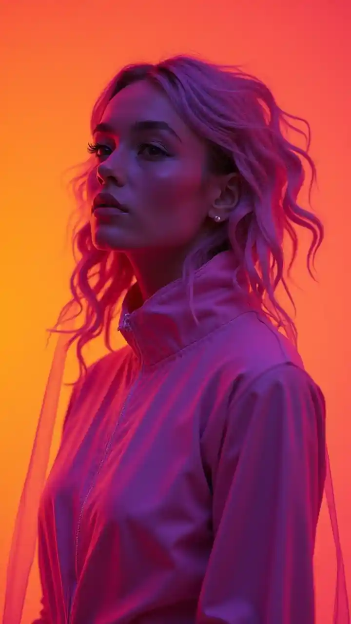 Высококлассное портретное фото Nike в светло-оранжевой студии загадочного киборга из фильма "Ex Machina", в стиле Лоры Макабреску, фиолетовый туман, тень, высокий контраст, неоны, нося минимальную светло-фиолетовую одежду, анаморфный объектив, сверхреалистичный, гипердетализированный, Canon EF 14mm f/2. 8L II USM объектив на камере Canon EOS 5D Mark IV с низким углом