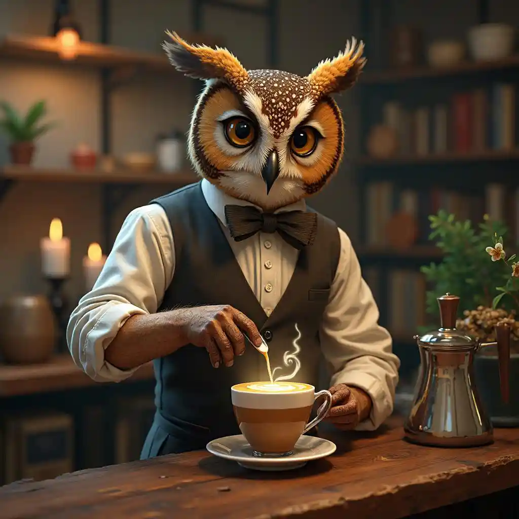 Представьте себе изящную сову по имени Теодор, бармена, известного изготовлением самого изыска кофе. Облеченный в костюм и галстук, Теодор осторожно наливает золотой поток эспрессо в уютном кафе под свечами. Пары скручиваются в тонкие узоры, образуя формы крыльев и звезд. В комнате полно деревенского очарования, его окружают книжные полки, горшечные растения и старинные кофеварки. Атмосфера очаровательна, с слабым золотым блеском