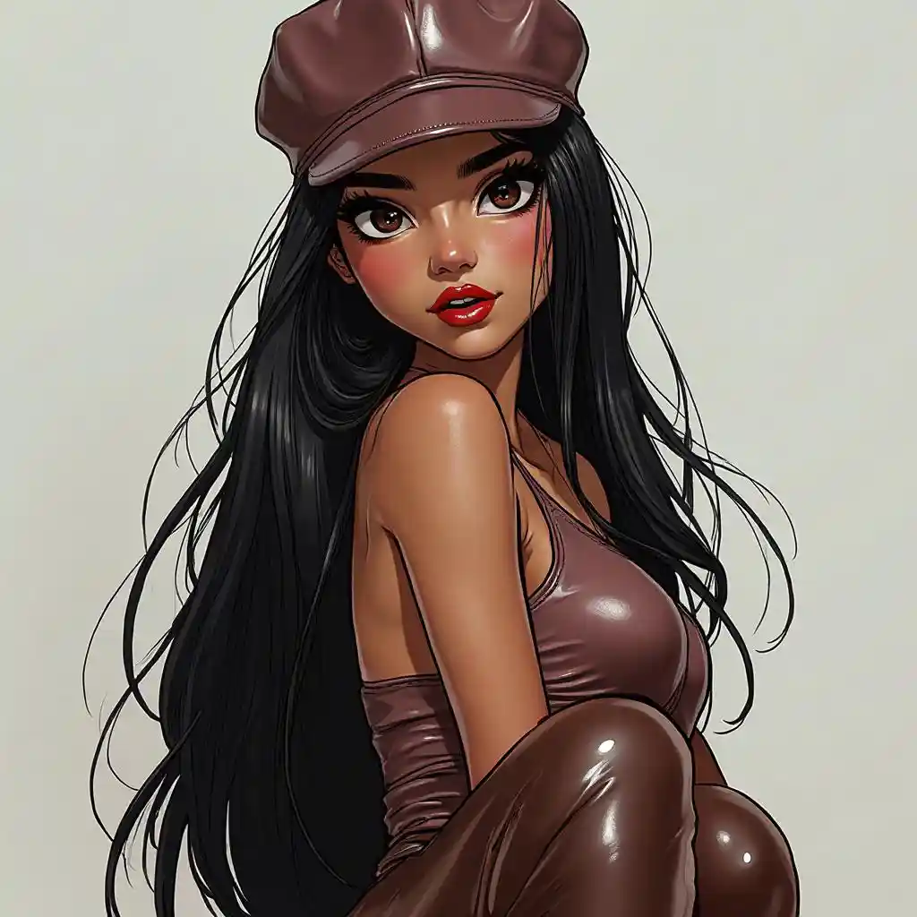 JacksonТам девушка с персидским лицом, длинными бровями, длинными черными волосами, красными губами, блестящей кожей, зеркальной шляпой, и блестящие кожаные брюки с длинными ногами.