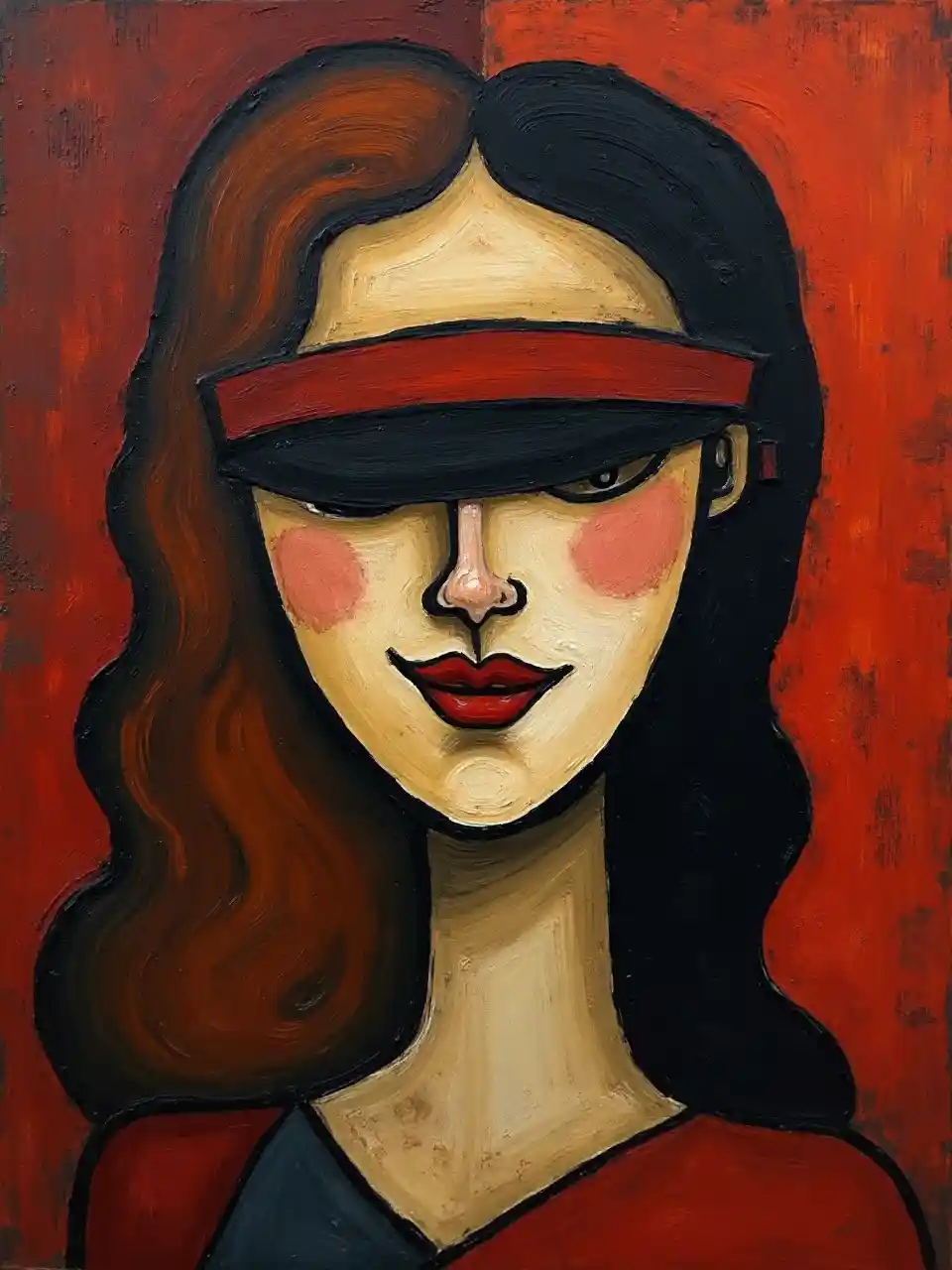 EmeryЖенщина портрет кубизм Пабло Пикассо стиль, с повязкой, красно-черные длинные волосы, улыбка