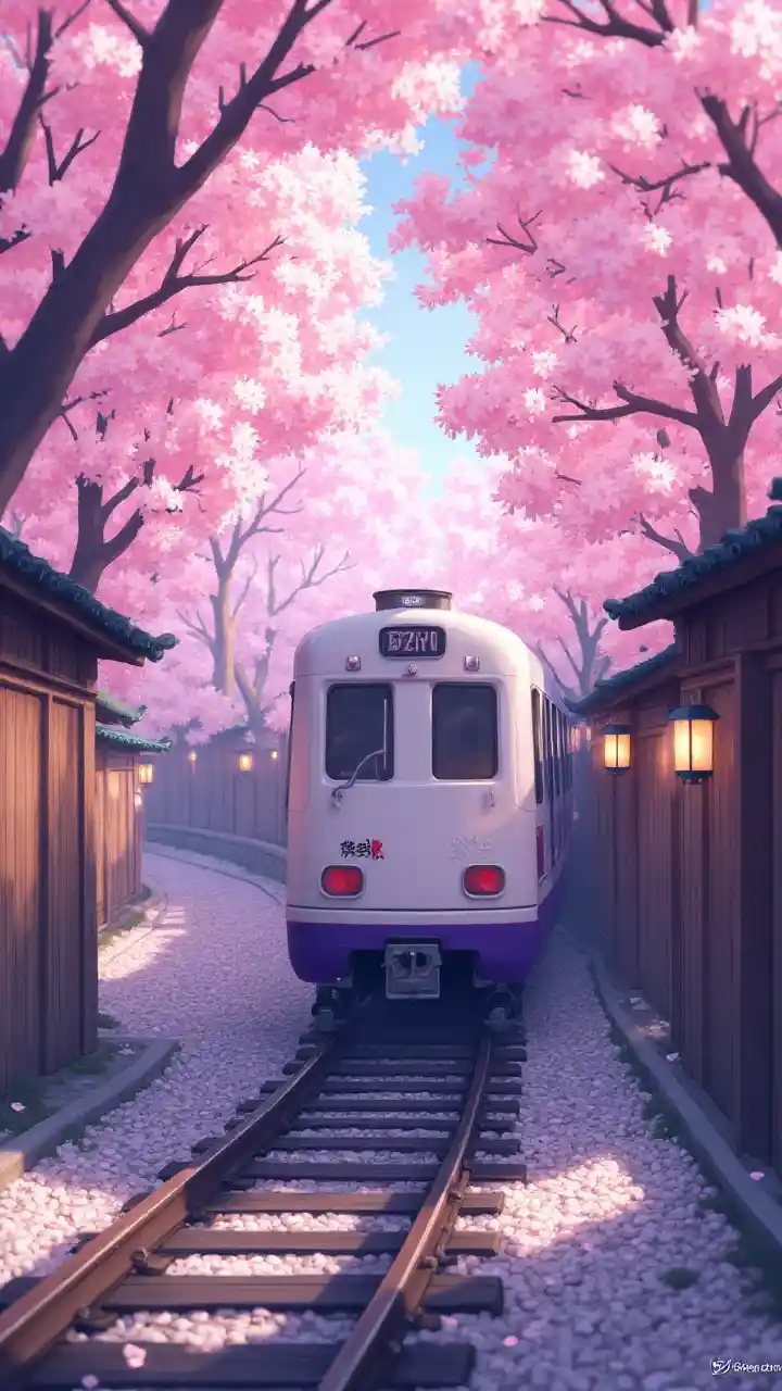 Через тоннель цветущей сакуры бело-фиолетовый поезд, несущий смех и мечты. На локомотиве сияет имя "Пиклюмен", когда лепестки танцуют в весеннем ветре. Уютные деревянные дома выстроены вдоль железной дороги, их бумажные фонари мягко раскачиваются, приветствуя предстоящее путешествие. - В настоящий момент в середине пути, Максим, помогите мне 6