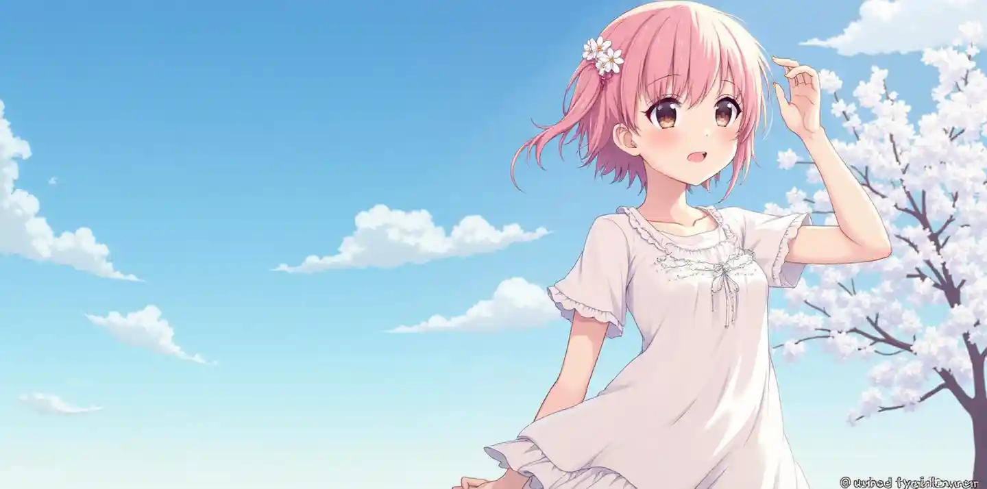 TinaМолодая девушка из аниме, вероятно, азиатка, с светлой кожей и короткими, яркими розовыми волосами, украшенными цветка вишни, изображена на фоне прозрачного, светлого