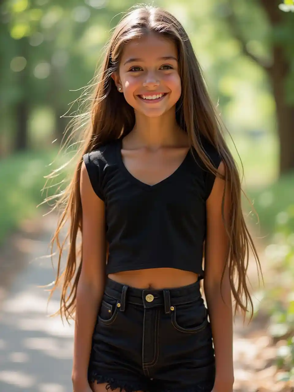 Полноцветный (((изображение))) с веселым, счастливым и игривым (похоже на девочку-подростка)) с теплым коричневой кожи и (очень длинные коричневые волосы), которые излучают невинную атмосферу. Сцена оформлена (((черной миниюшкой и соответствующим черным топом))), который акцентирует ее строй, молодой ноги и дополняет солнцем поцелованный цвет. Ее улыбка излучает радость и молодость, делая изображение похожим на летний день в жизни девочки-подростка. Естественное освещение.