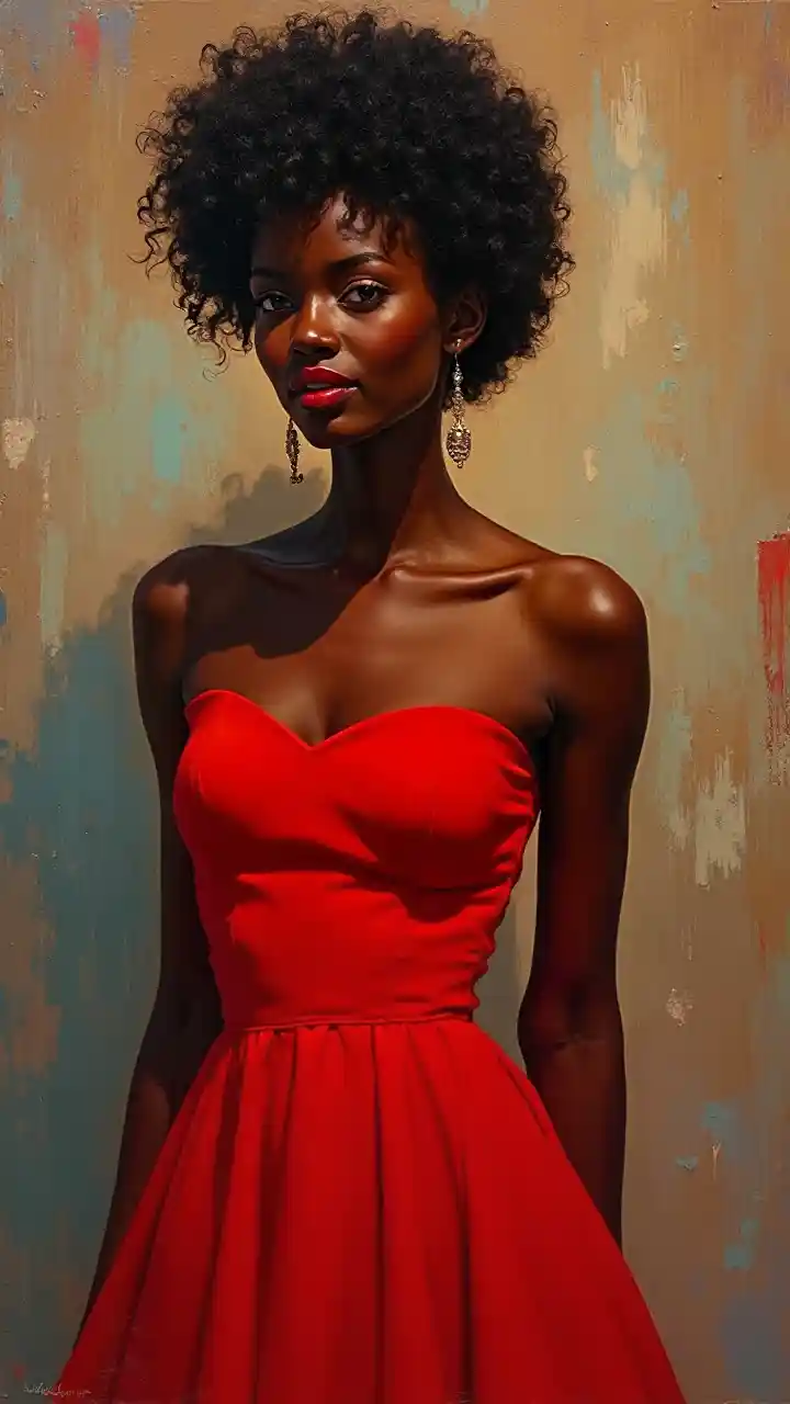 RobinПортрет красивой черной девушки в ярко-красном платье, живопись, масло, акриллический, Портрет, США, стиль Эрни Барнс