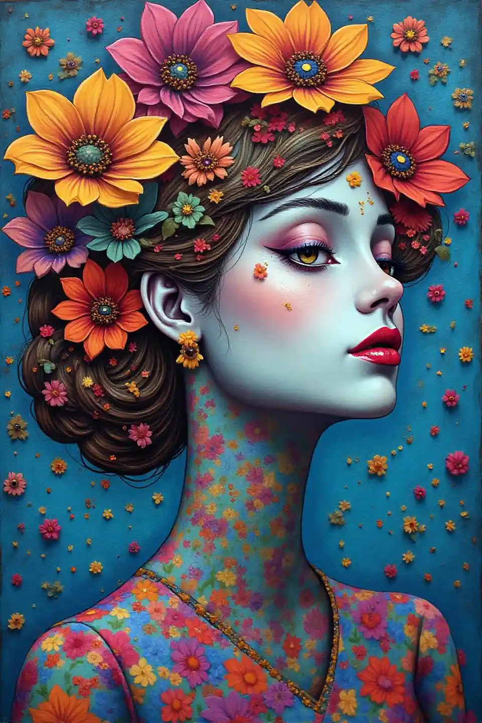 KinsleyКартина женщины с цветами в волосах, психоделическая !!!!, психоделическая работа, психоделический стиль, психоделический !!!!!!!
