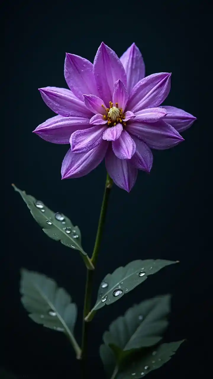 Реалистичный фиолетовый цветок с росой на тёмном фоне
