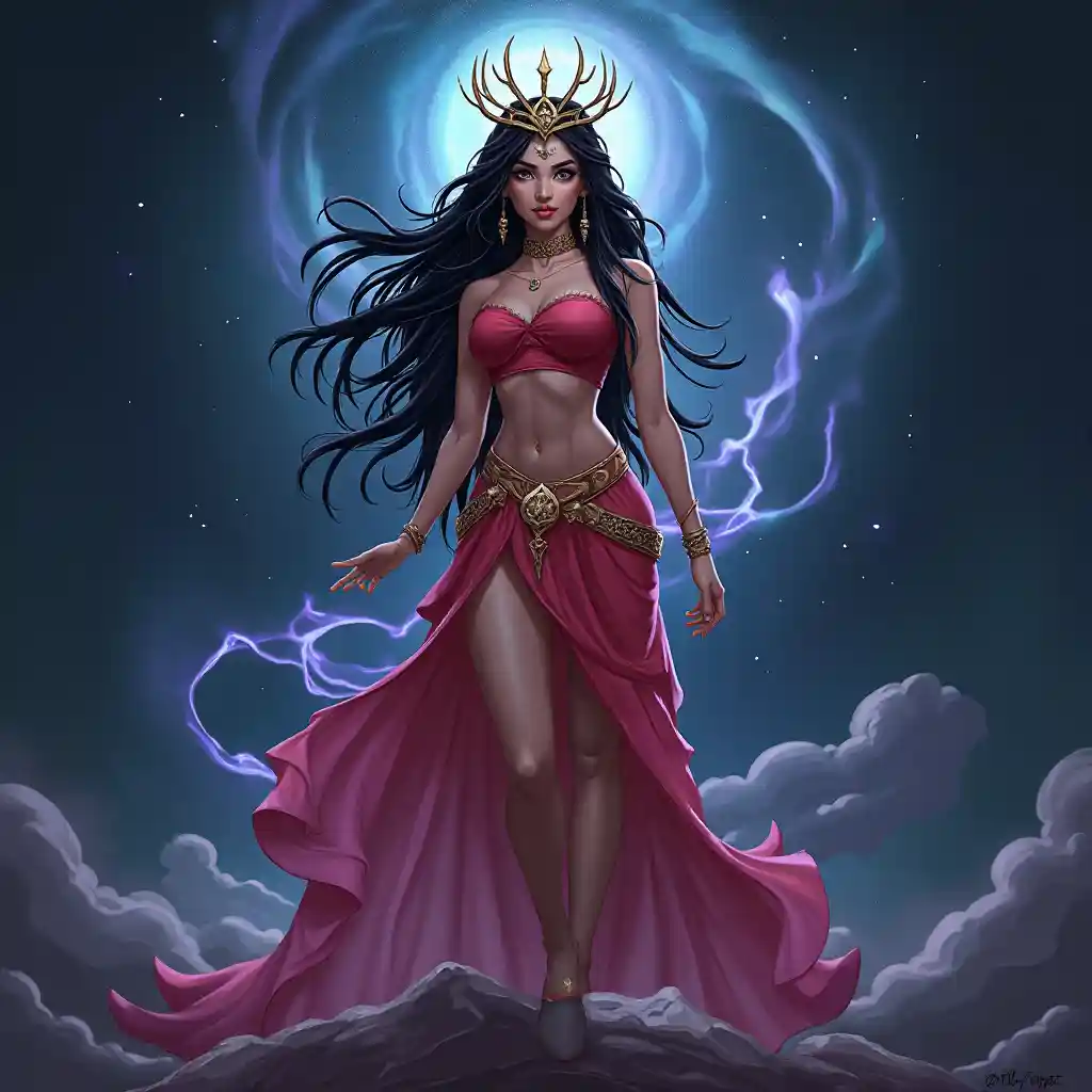 Цифровая иллюстрация с изображения королевы Медузы полного тела, угол камеры о фантастическом персонаже с магической аурой, уверенно стоящем в центре изображения. На изображении также изображена красивая женщина с длинными черными волосами, одетая в золотую корону и раскрывающая красную и золотую одежду с текущей юбкой. У нее стройный физический состав и уверенное выражение лица. и у нее черный цвет волос. она носит золотую корону на голове, и ее наряд состоит из красного топа и розовой юбки с золотыми акцентами. Фон - темное звездное небо с вихрями синих и фиолетовых световых эффектов, создавая магическую атмосферу.
