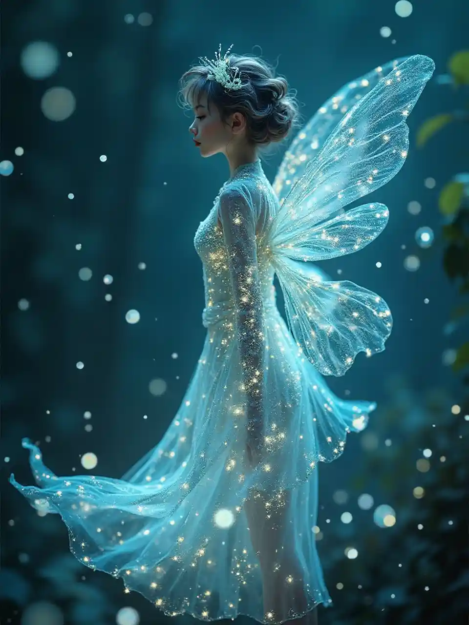 (Двойная экспозиция) (Прозрачная биолюминесцентная фея) с причудным волшебным светом, напоминающим капли биолюминесцентной воды. Эфирная форма феи излучает мягкий, мерцающий свет, который отражает яркие природные узоры. Ее платье, сгущенное в натуральном мире, создает очаровательный эффект двойной экспозиции, вызывающий чувство удивления и очарования. ((Ралакс Дримленд стиль искусства)) ((Схема цветовой палитре Ралакс 3D иллюзии)) ((Оптический, полный вид тела)) сверкающий эффект искря, демонстрируя элегантность и изыска феи. ((Илюстрация: J.P. Baterre, Karol Bak, и Giovanni Boldini, представляющая собой уникальное слияние фантазии и природы)). С его характерным стилем, художественное произведение имеет высокий уровень детализации и качества, что делает его действительно великолепным и уникальным.