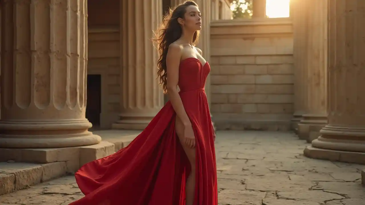Представьте себе женщину в смелом, темно-красном платье с щелчкой до бедра, уверенно стоящую перед древней каменной колонной. Ее платье гладко течет, когда она смотрит в далекое время, ее красота вечна и захватывает.