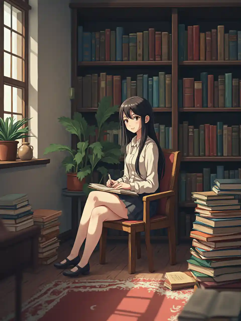 Ретро-аниме изображение девушки, сидящей в библиотеке с книга