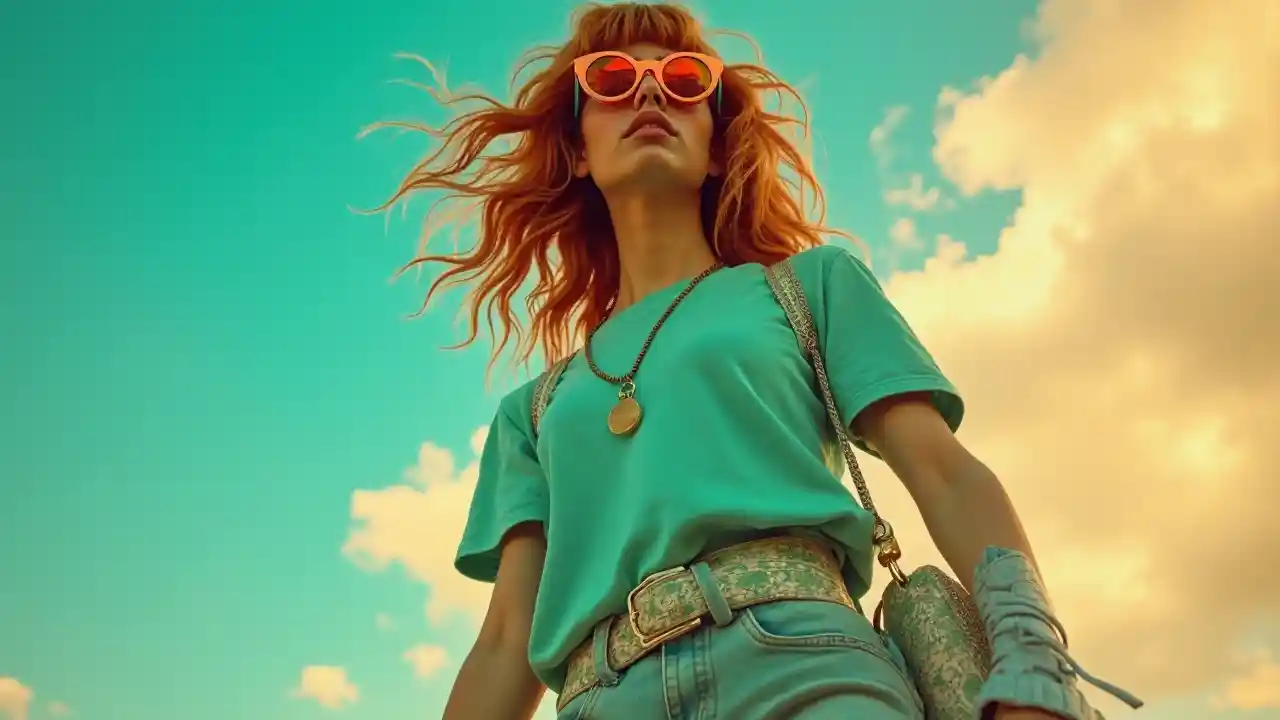 носящую большую футболку, и в кроссовках, Винтажный гламур Ультрасовременная эстетика Электрический зеленый огненный оранжевый ретро дива футуристические уловки объемные волосы отражающие зеленый солнцезащитные очки приглушенное золотое наклонное эфирное макияж