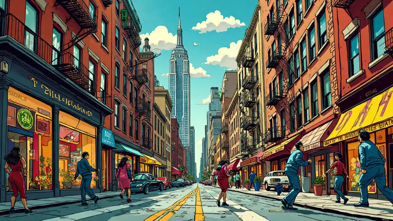 Стены Нью-Йорка в стиле комиксов 70-х, яркие, смелые цвета, динамичные персонажи в позах, ручные линии, преувеличенные выражения, знаковые здания, такие как Эмпэйр Стейт, яркие городские огни, ретро-эстетика, выразительные тени, оживленные уличные сцены, ностальгическая атмосфера, энергия городской среды, очень подробные комиксы, напоминающие о старых графических романах.