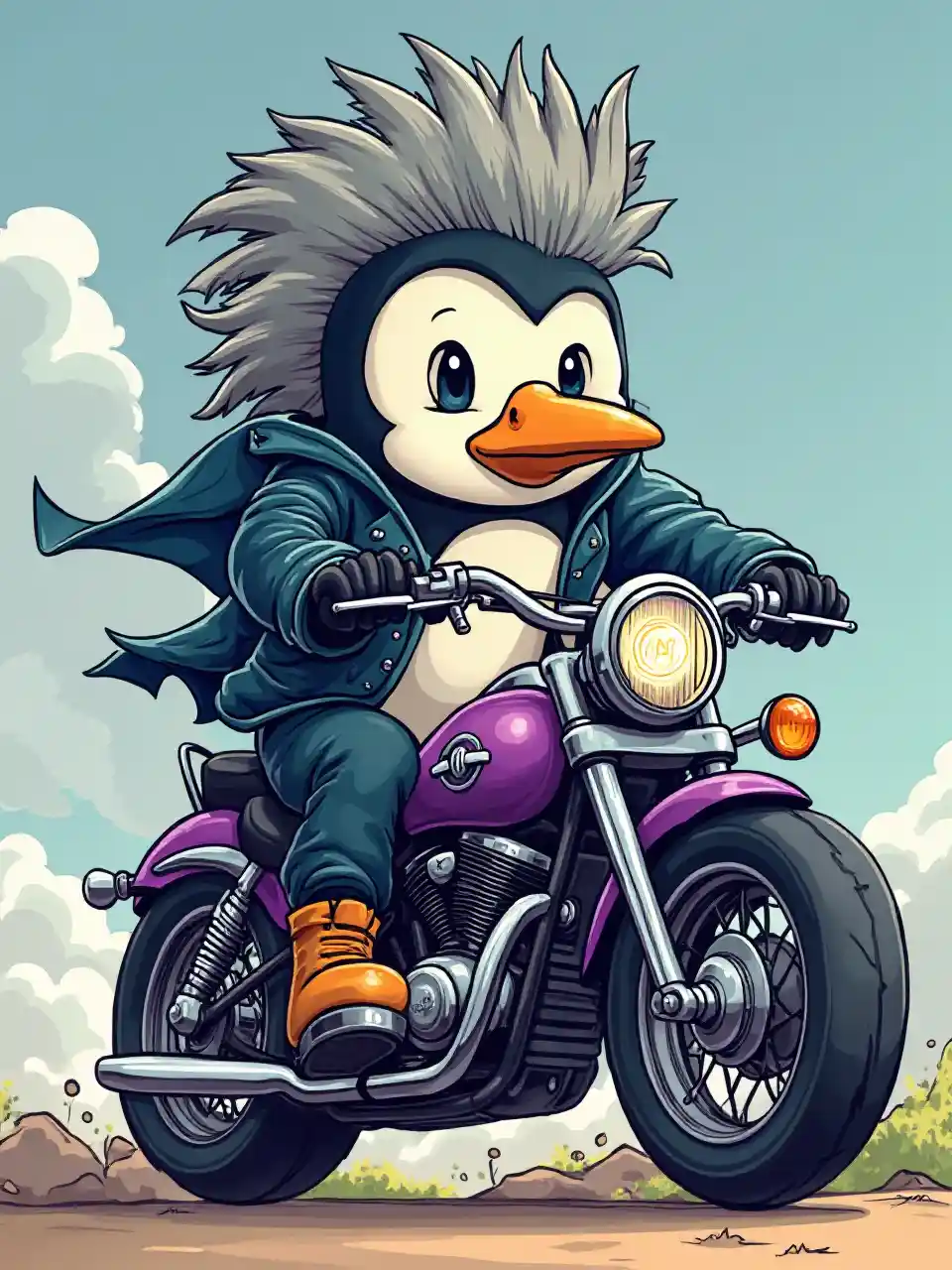 AudreyРисунок рок-н-ролл пингвин с серым мулетом едет на фиолетовом мотоцикле