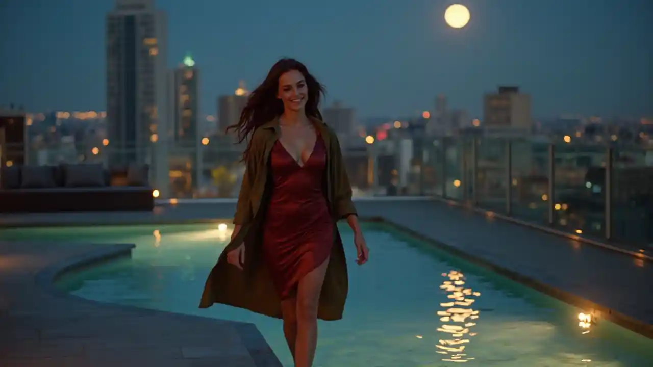 Красивая женщина с длинными, волнистыми темно-коричневыми волосами, одетая в темно-красное атласное платье и открытая оливко-зеленая рубашка, медленно и грациозно идет к камере на крыше террасы. Она босика, улыбается тепло, с мягким, расслабленным языком тела. В его крае есть сияющий бассейн, современная стеклянная перила и горизонт города с высокими зданиями и огнями. Полнолуние светит в ночном небе, излучая мягкие яркие и нежные тени. Сцена имеет кинематографическую атмосферу с теплым освещением, отражениями из воды и роскошным, расслабленным настроем. Камера отслеживает ее движения, когда она идет вперед, с плавными движениями и реалистичными деталями лица.