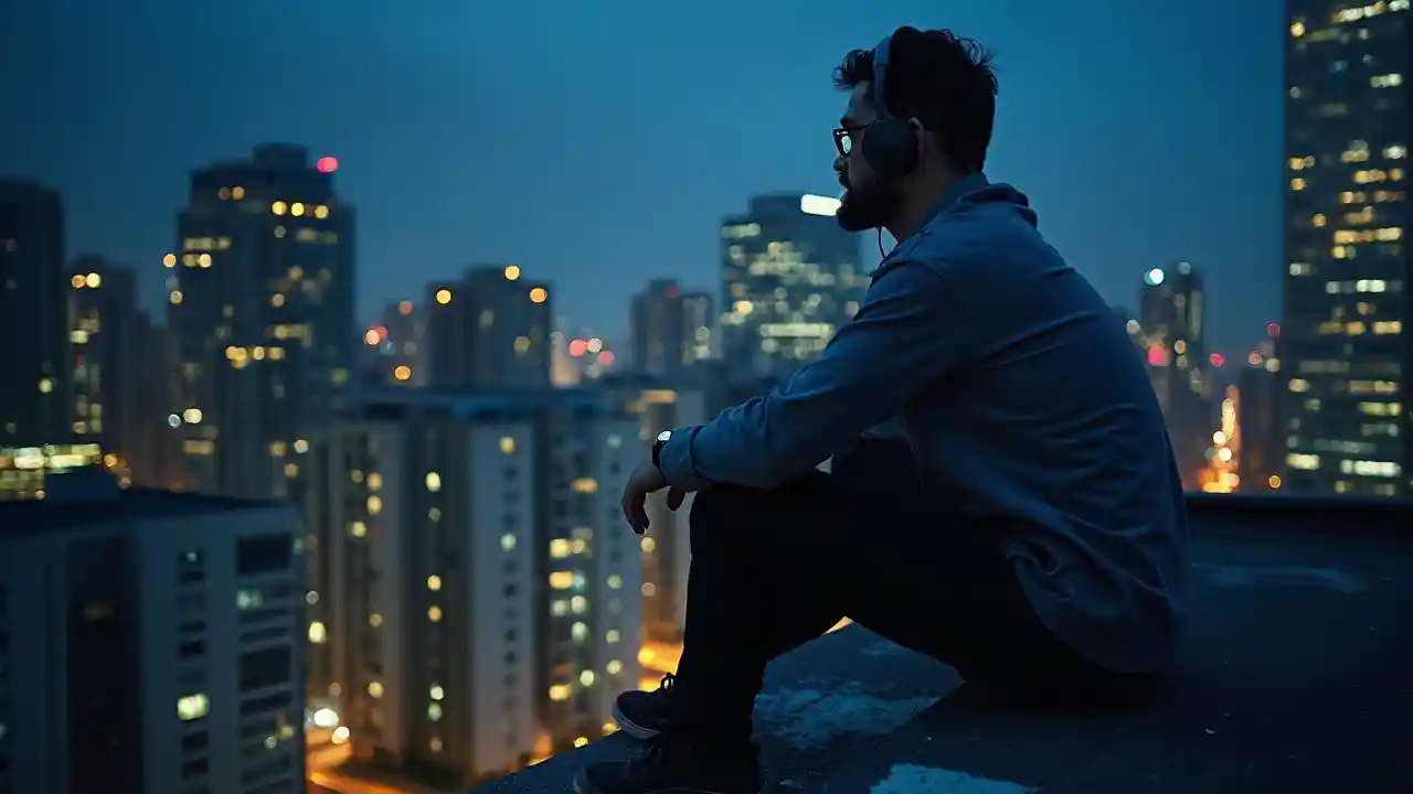 Мужчина, слушающий музыку на крыше ночью