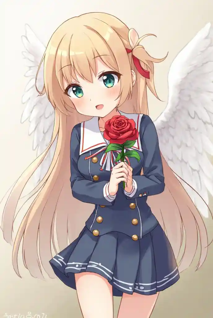 Розовый риф, школьная форма Святой Глории, в руках роза, крылья,
