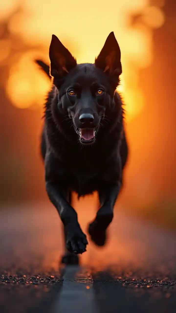 WilliamБольшая черная собака бежит по дороге с горящими глазами на фоне заката
