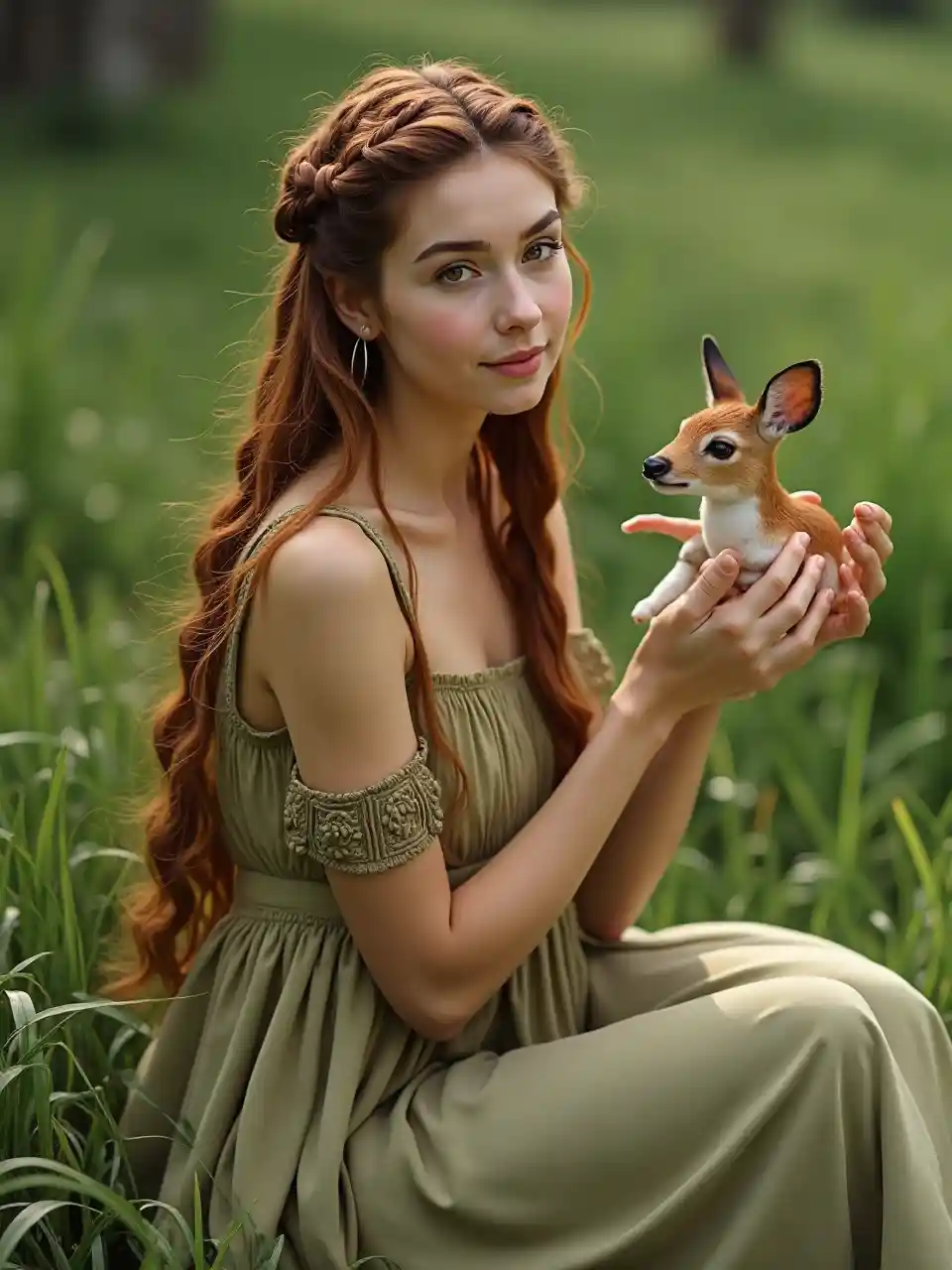 (((Удивительно красивая женщина))) с (((спокойными и приглашающими глазами))), спокойно сидящая на (мягко наклоненная травяная зона), излучающая чувство (безмягкого пасторального обаяния). Ее волосы (богат, теплый коричневый цвет) с (сложный и элегантный косы), которые рам ее лицо в (мягкий, естественный светит). Она одета в (мягкое пастельно-зеленое и коричневое платье), которое (смешивается и дополняет пышной зеленой травой. Она (осторожно держа в руках крошечного, трепещущего оленя) смотрит прямо в глаза зрителей. Олень (удивительно красивый) с (сверкающими белыми флангами), которые соответствуют (богатому, теплому коричневому цвету травы).