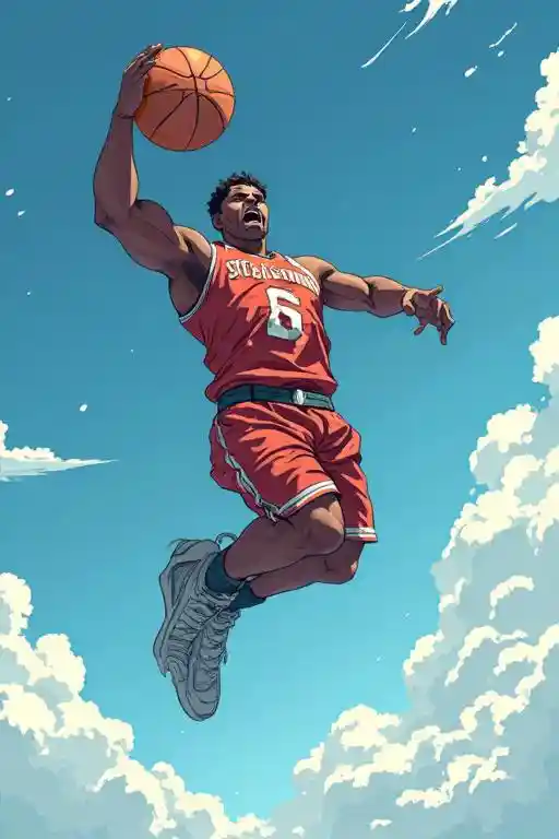 Мускульный баскетболист в стиле аниме танцует в небе, решает драматический удар. Его глаза горят решимостью, он держит мяч одной рукой