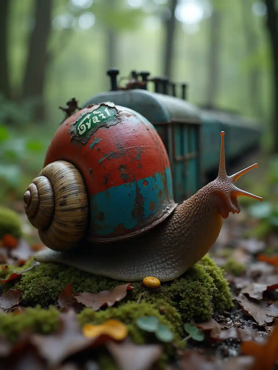 Реалистичная улитка с необычной раковиной: вместо естественной раковины она несет поезд на спине. Поезд красно-синий с видимыми царапинами и бледневным зеленым знаком "СТ". Слизняк с текстурой контрастирует с металлической поверхностью краски поезда. Его антенны тянутся вперед, когда он медленно движется по влажному лесу, покрытому мхом и упавшими листьями. Освещение мягкое и рассеянное, создавая смесь реализма и сюрреализма