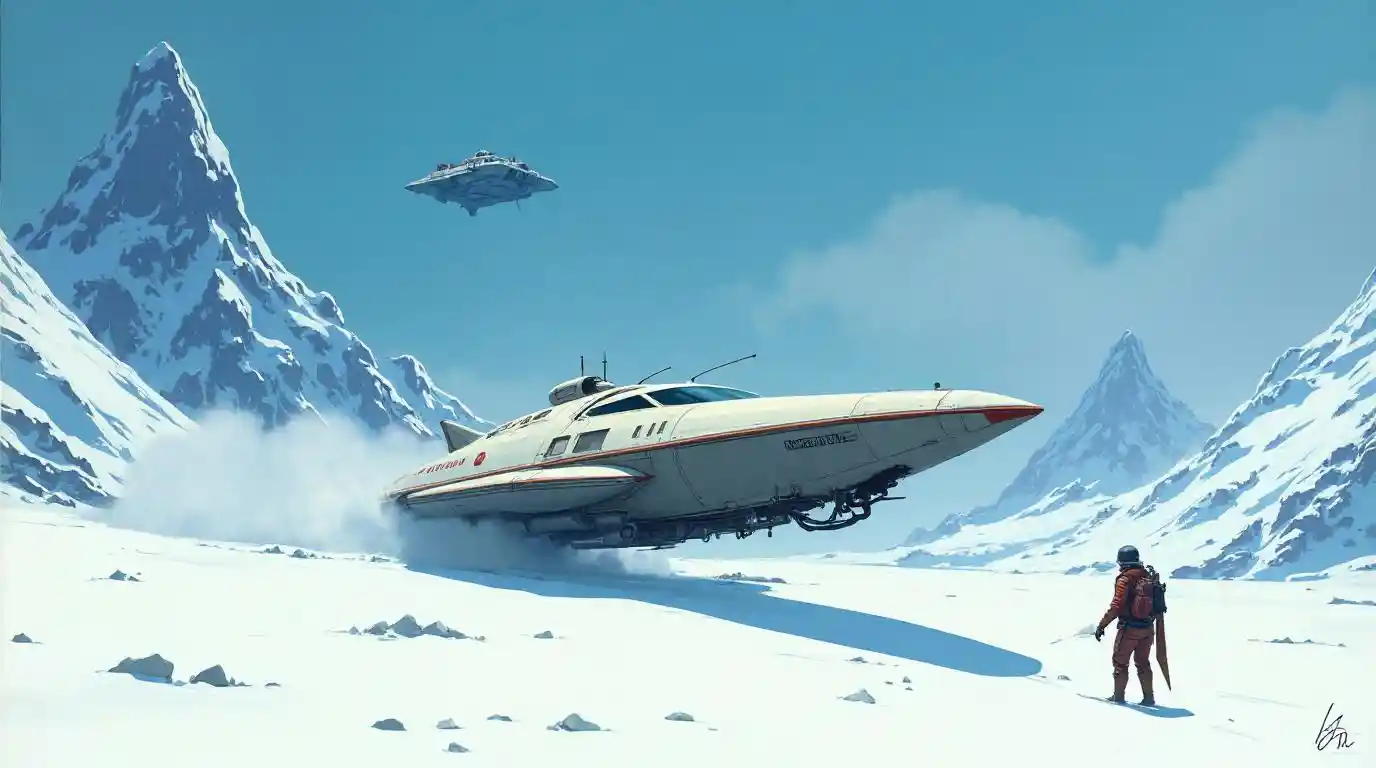 Инопланетный корабль в снегу, иллюстрированный в стиле Мобиуса и Ральфа МакКьори и Джона Харриса, холодная синяя планета с белыми ледяными горами на фоне, космический корабль, летящий над ними, концепт фильма "Фи" 70-х годов. --ar 77:60