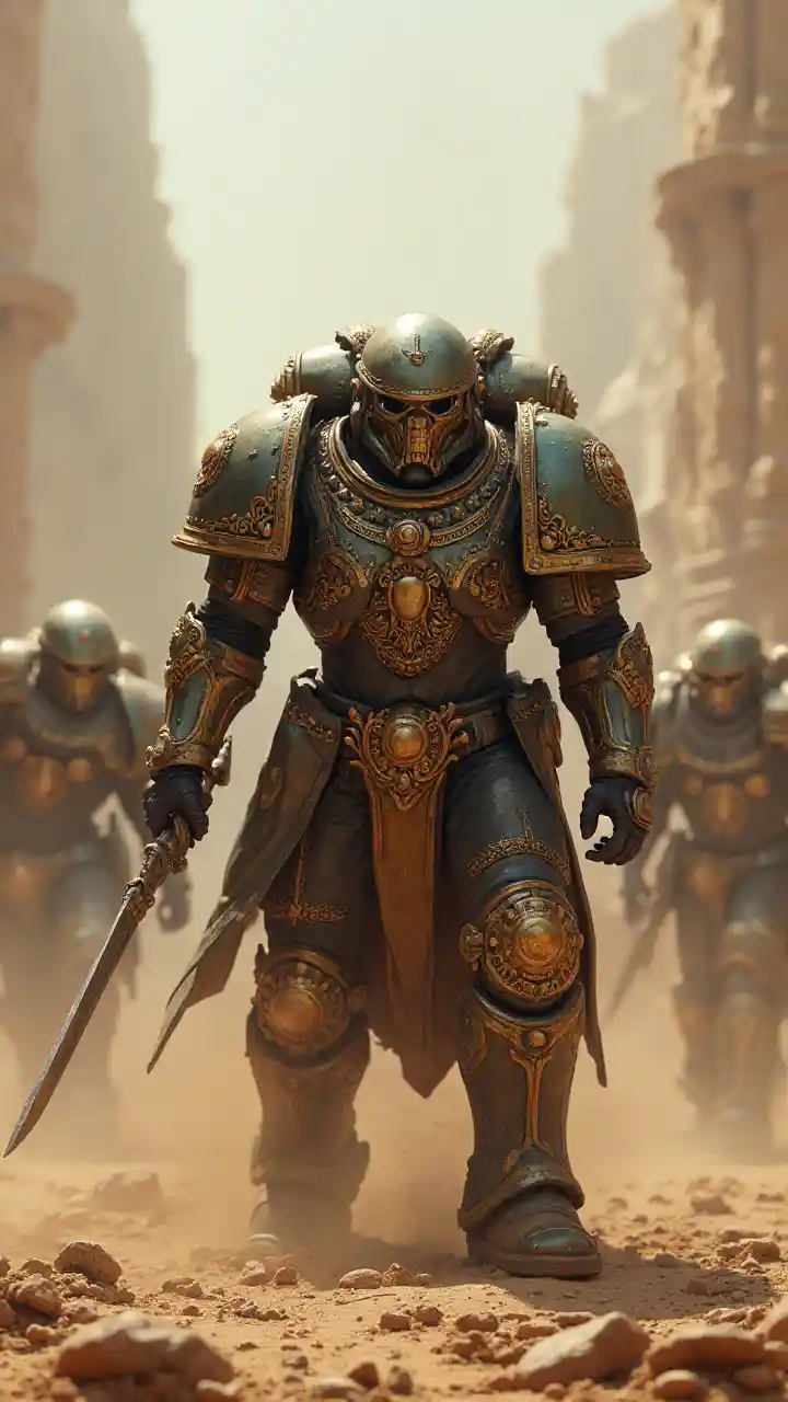 Warhammer 40k космический морской в позолоченной украшенной броне сражается с армией инопланетян, разорванной войной, инопланетная песчаная планета, акционная поза, огромный меч, реалистичный, 8k, сверх высокой детальности, военная сцена, в бою, туманное освещение, песчаный камень разрушенные здания,