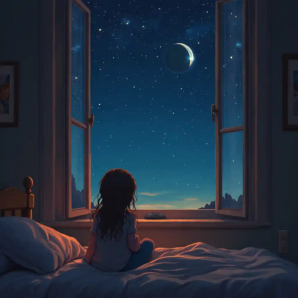 WilliamДевушка смотрит на звезды из окна спальни в сказке