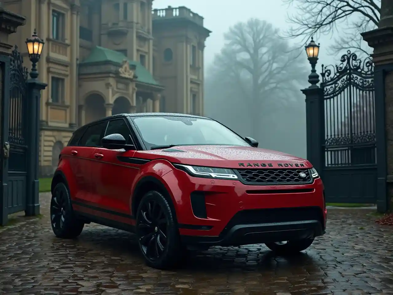 Красный Range Rover Evoque в стиле стемпанк с блестящими фарами и глянцевой полированной отделкой, паркованный величественно перед украшенным винтом дворцом. Внутри атмосферы царит жуткость и таинственность, которую подчеркивает густое покрытие тумана, вращающееся вокруг сложных кованых железных ворот и мощенных дорог. Теплая атмосфера, контрастирующая с призрачной обстановкой, проникает в роскошный автомобиль, который является маяком современности среди шепотов истории, вдохновленный элегантным тоном Artgerm.