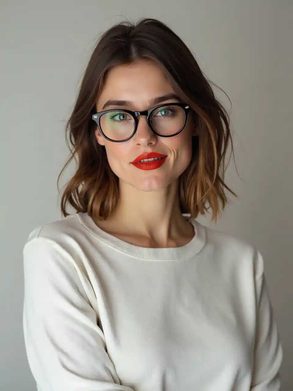 Девушка в тридцать. У неё карие глаза и волосы, черные очки и красная помада. Она в белом длинном рукаве.