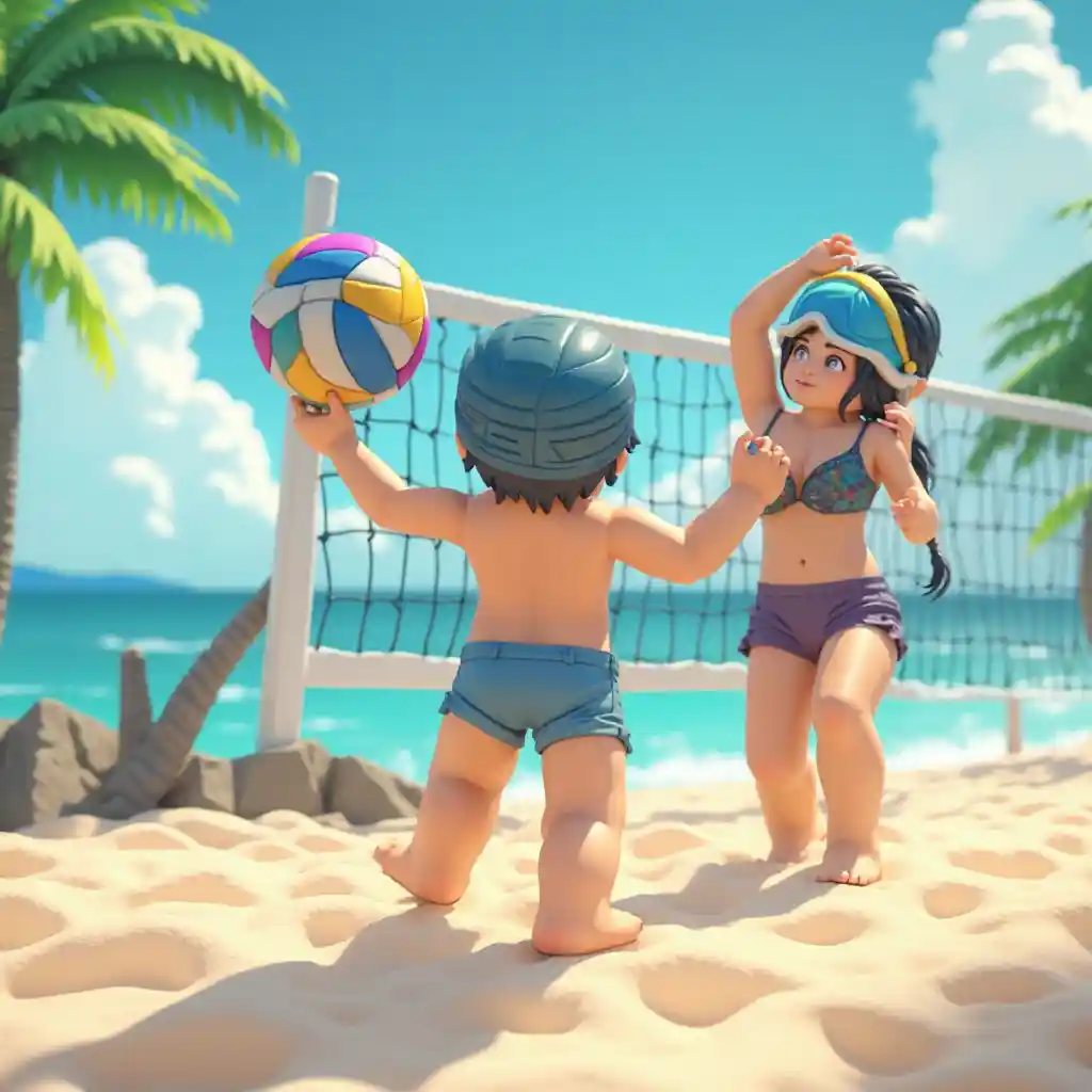 Создание летней пляжной сцены с персонажами Roblox, играющими в волейбол