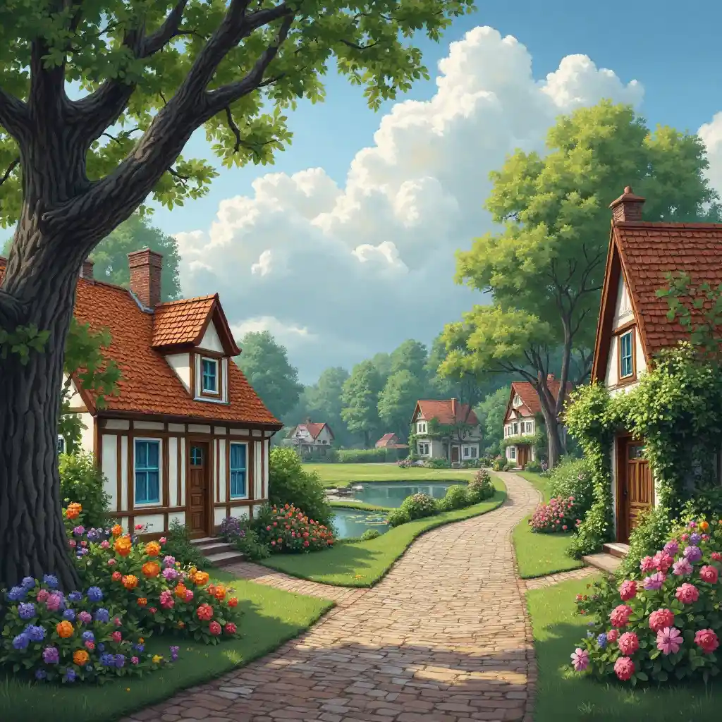 летняя деревня, отходящий дождь, мокрые мощеные дороги, дубы, липы, центральная зелень с прудами и соками, цветущие каштаны, цветочные клубы, цветущие лозы, милые дома с цветами и украшенные воротами, пушистые облака, иллюстрации изобразительного искусства