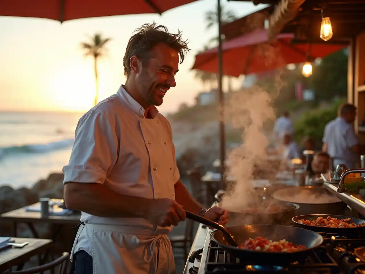 Cooking in a cliffside trattoria, a White man in his 40s glows in a chef’s apron. Ocean views and sizzling pans frame him, his culinary flair and warm smile exuding passion and coastal charm in a rustic, open-air setting under a golden sunset.