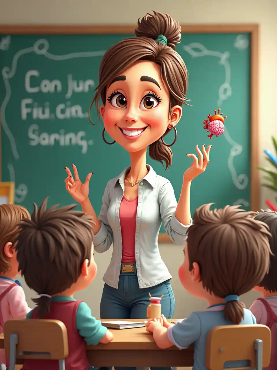 JaydenНарисовал карикатуру учителя. "Объекты школьного фонда". Учительница должна иметь мозг в правой руке и сердце в левой. Кроме группы детей и девочек вокруг учителя. На доске за учительницей должно быть слово "включение".