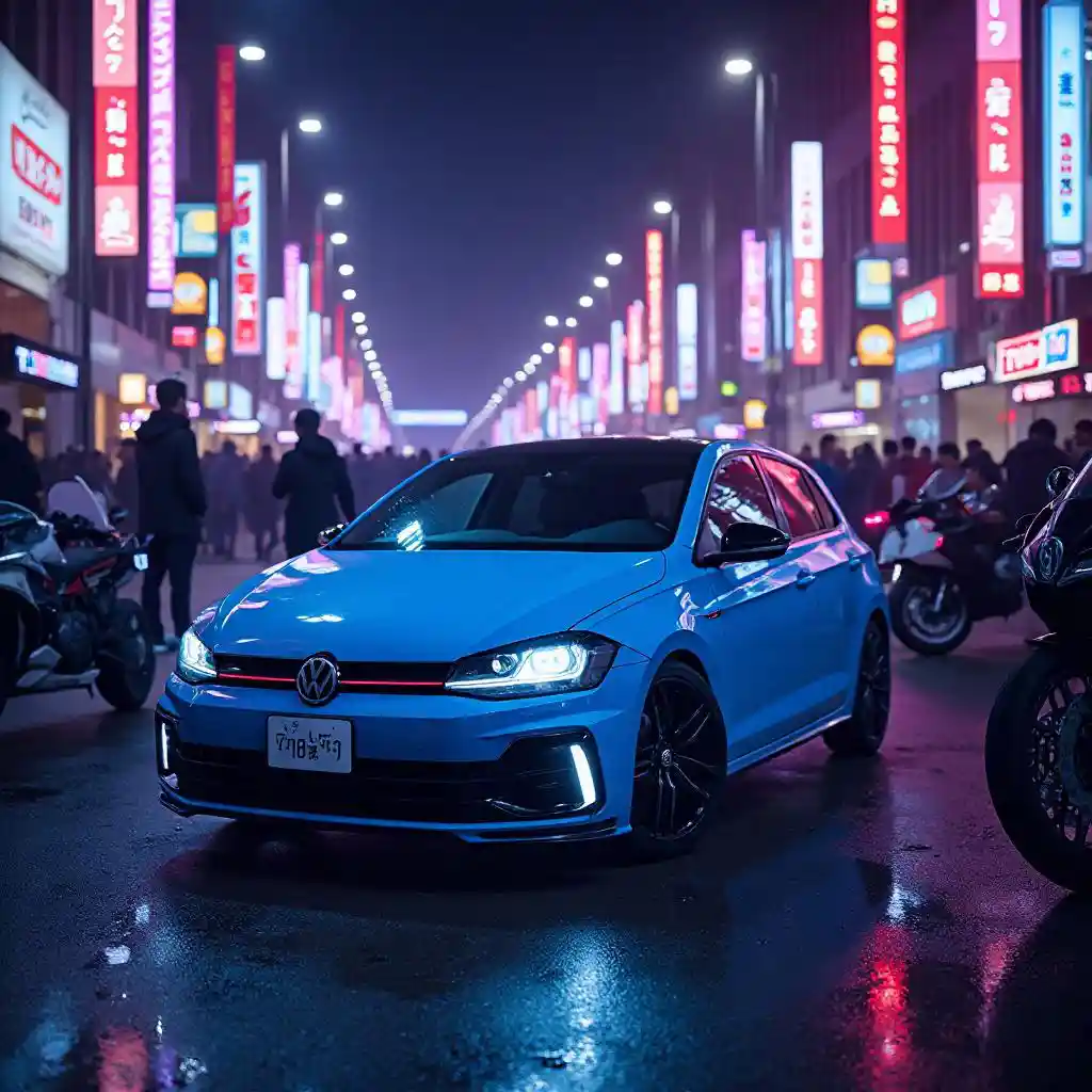 HarperНеоновый автомобиль Volkswagen Polo GT с цветным фоном и окруженный моторами Ducati и BMW под уличными огнями Токио вокруг людей и диджея