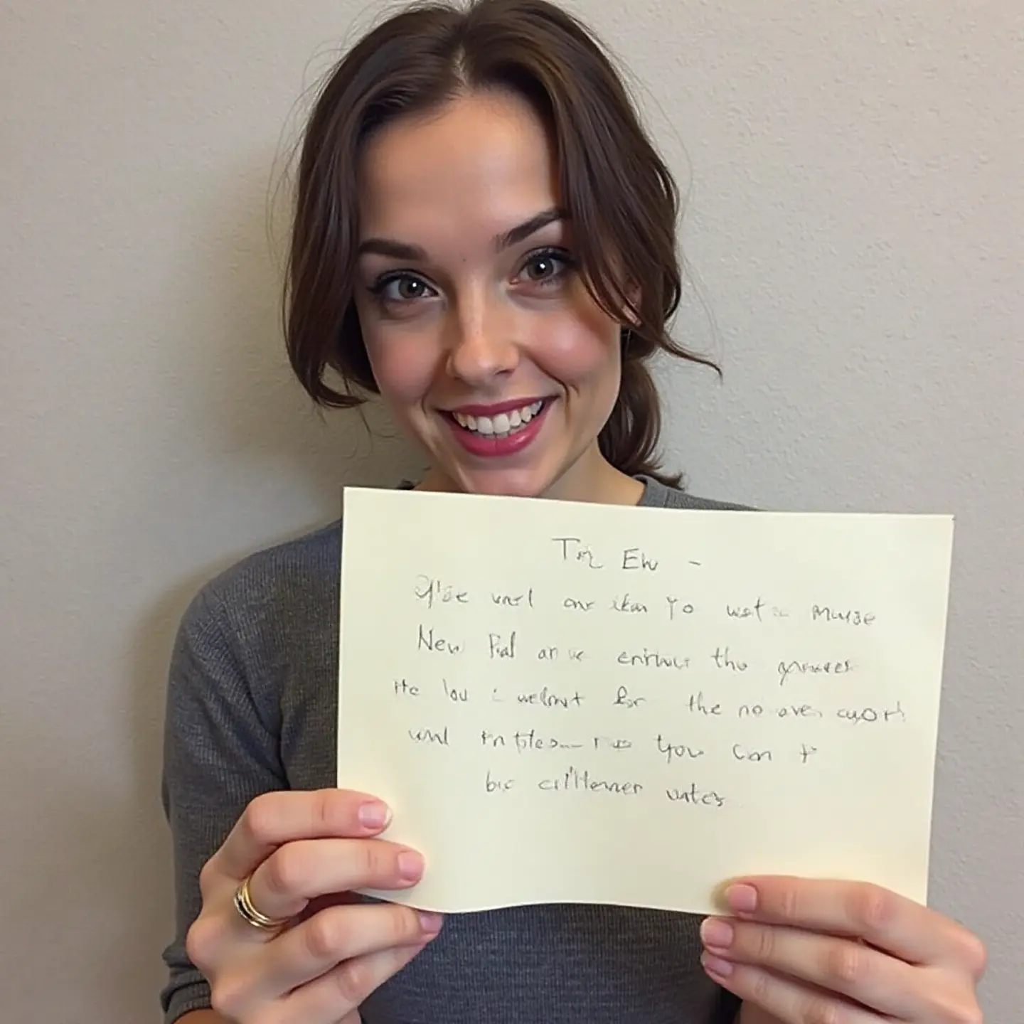 EvelynТори Блэк с фотографией с бумагой в руке без записи, с ее лицом.