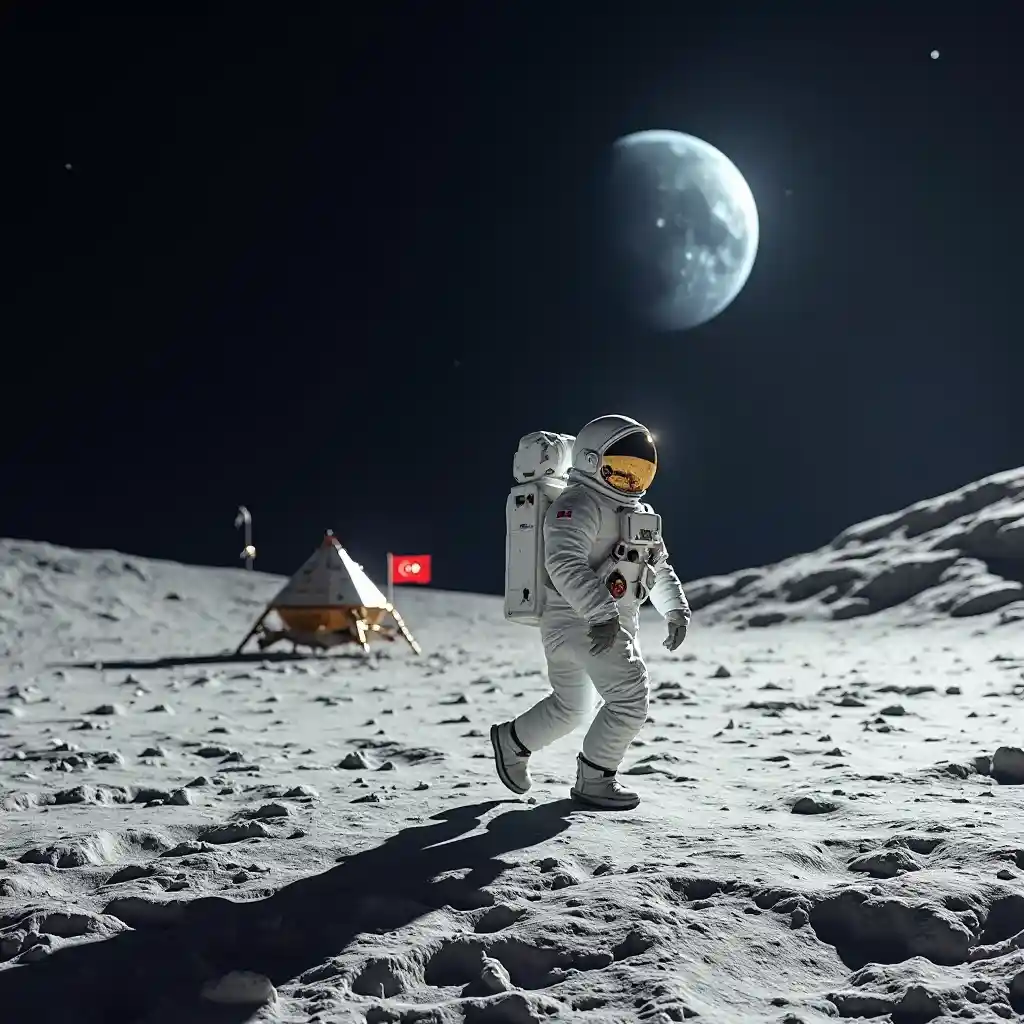Турецкий астронавт ходит по лунной поверхности, далекий мир виден позади него. С правой стороны астронавта должен быть лунный приземляющийся аппарат.