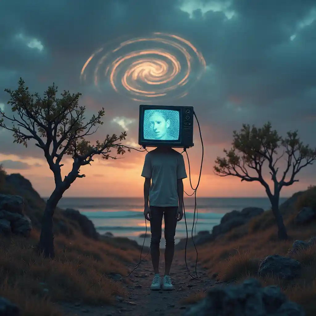 Сюрреалистический пейзаж, купающийся в сумерках оттенках, где стоит одинокая фигура, его голову заменил старый телевизор. На мерцающем экране появляется его собственное лицо, искаженное и замыкающее в бесконечности. Электрические провода телевизора тянутся к горизонту, переплетаясь с близлежащими деревьями, которые несут светящиеся электрические плоды. Слабый статический шум пронизывает воздух, сливаясь с дальним звуком океан. Сверху вращаются спиральные облака, отражающие статические рисунки с экрана телевизора, создавая калейдоскоп цветов в небе.