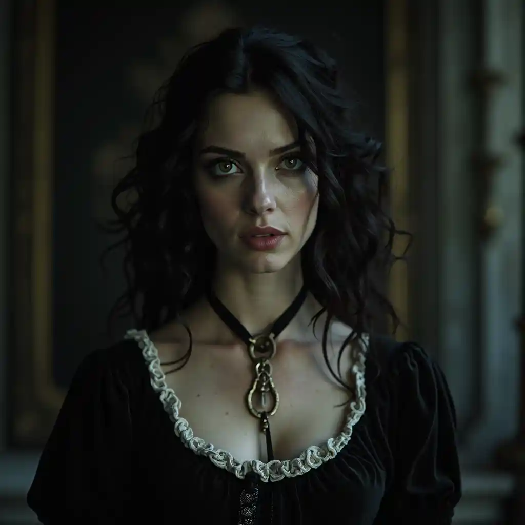 Темноволосая, красивая женщина с бледной кожей в темном русском аристократическом наряде 18-го века, (1980-е годы темная фантазия кинематография:1.5), реалистическая детальная фотография, гротескный вампир, зерно фильма, драматическое освещение, (вамрные клы:1.2)